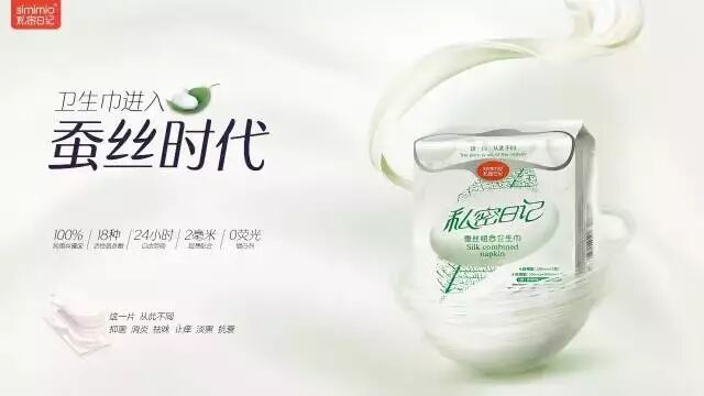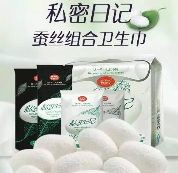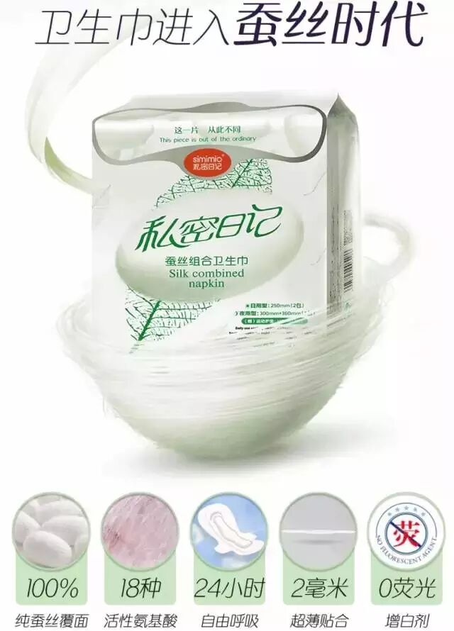 空白市场即将引爆——市面上的卫生巾,98%以上是化纤和绵柔材质,“私密日记”是微商市场上仅有的一款100%纯蚕丝组合的卫生巾,市场完全空白!