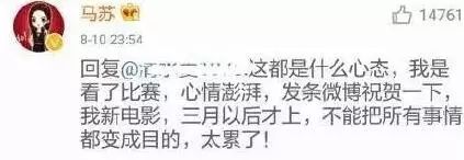 既然说没有复合,那她就是要蹭热度炒作吗?这个马苏也给出回应:看了比赛,心情澎湃……新电影三月以后才上”,还给大家上了附送了一句鸡汤“不能把所有的事情都变成目的,太累了!”