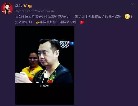 马苏的微博配图是在一张翻拍自屏幕的孔令辉照片,配文是:“看到中国女乒锁定冠亚军我也就放心了,睡觉去!孔教练最近伙食不错啊,不过依然粉帅。中国队加油,中国队必胜。”这一发成功给自己还有孔令辉送上了热搜,一晚过去了,现在还名列前茅。