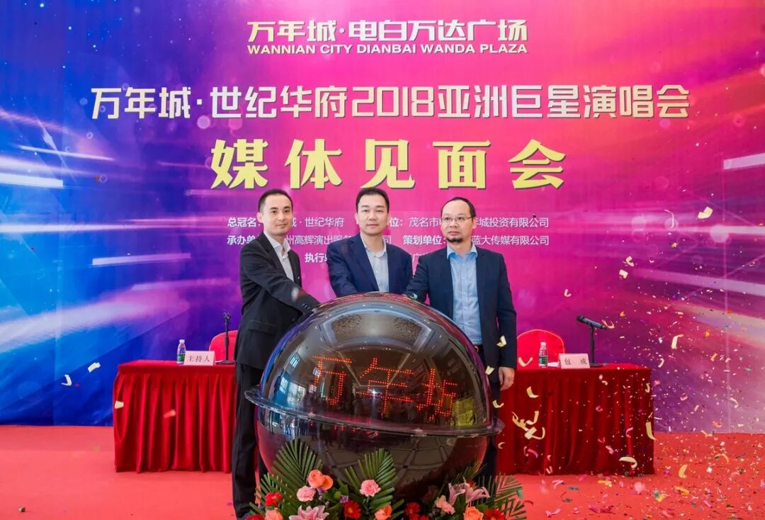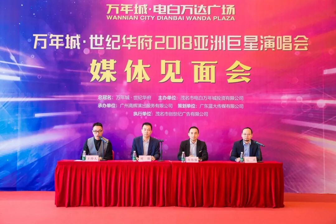 “万年城·世纪华府2018亚洲巨星演唱会”定于2018年11月10日晚上8点在电白体育馆盛大举行。本次演唱会由茂名市电白万年城投资有限公司主办,万年城·世纪华府全程独家总冠名,广州高辉演出服务有限公司承办,广东蓝大传媒有限公司总策划,茂名创世纪广告有限公司执行。