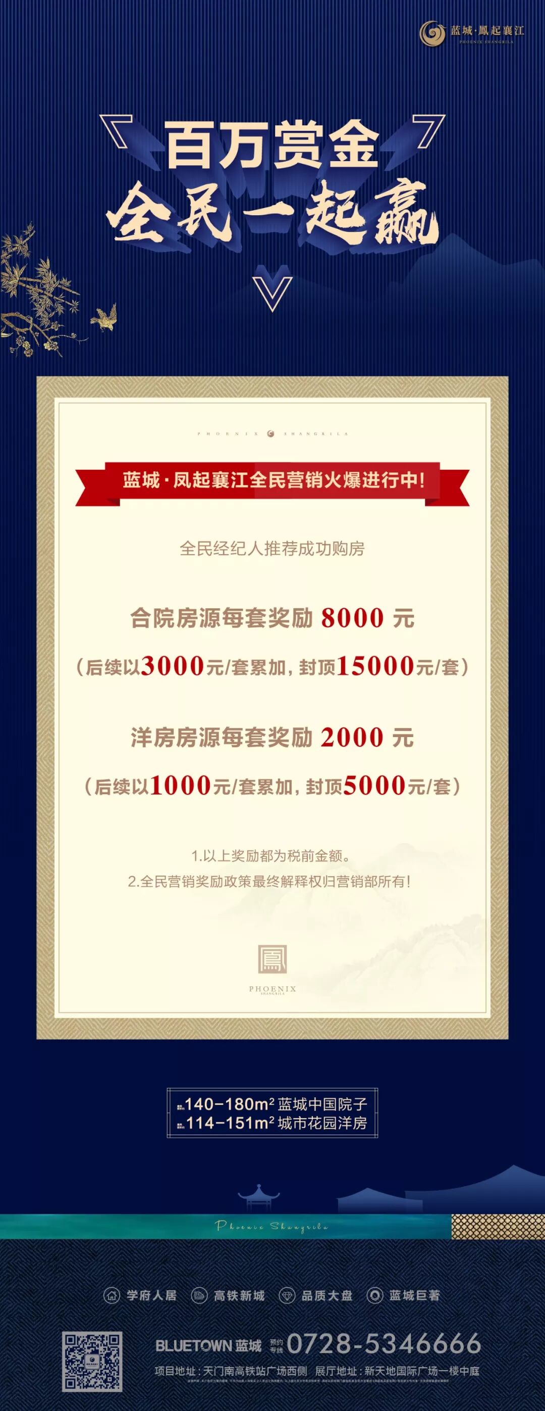 全民营销火爆进行中,全民经纪人推荐成功购房,合院每套奖励8000元,洋房每套奖励2000元。若单个经纪人推荐成交2套房源及以上,合院后续以3000元/套累计增加,封顶15000元/套;洋房后续以1000元/套累计增加,封顶5000元/套。