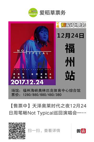 12月24日福州海峡奥林匹克体育中心综合馆,天泽奥莱时代之夜周笔畅“Not Typical”巡回演唱会收官站,平安夜限定开唱。欢迎到现场与笔笔一起度过2017最后的狂欢时刻。