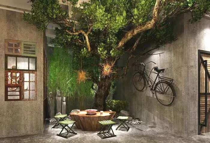 一家烧烤店,不经修饰的“水泥墙”,自由生长的绿植,桌上的老式暖壶、瓷盆儿,木框窗户,仿佛回到了记忆中的小时候。