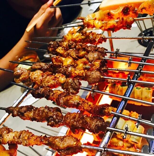 主烤羊肉的烤串店,开放式厨房,可以看到师傅们在处理生肉和其他食材。每桌都是无烟电烤,吃完不用担心身上有烧烤味儿。