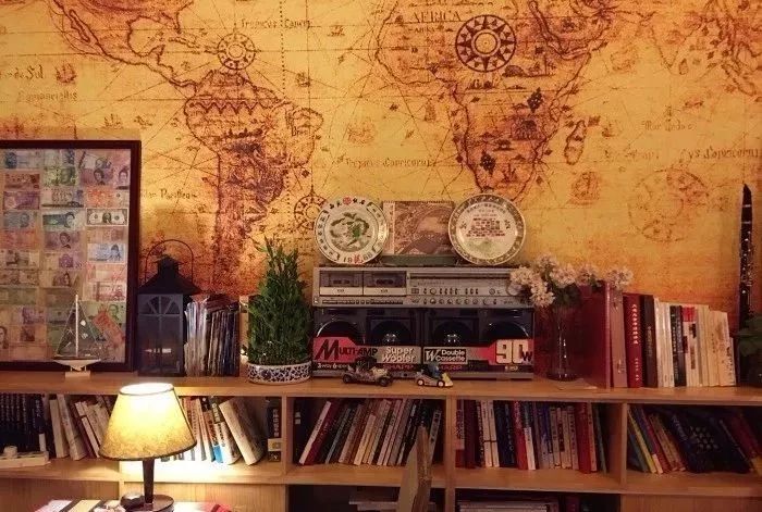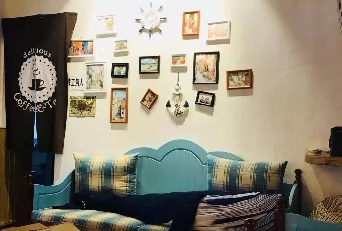 一家咖啡馆,环境清新优雅,松软的沙发,随意摆放的文艺画,长长的书架摆满了各类书籍,复古的台灯,像是家庭小馆一般的温暖舒适。