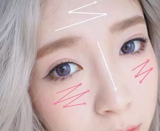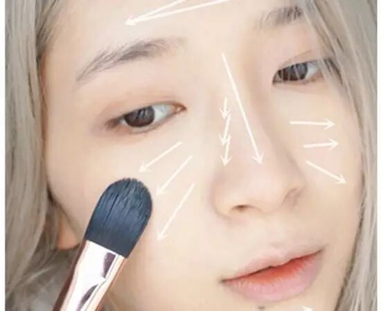 第一步:UD粉底液,用平头粉底刷仔细按照标注的方向上粉底,先铺开再点拍的方式,脸部各个细节都要注意到,脖子处也要用刷子带过,不然容易假面哦。
