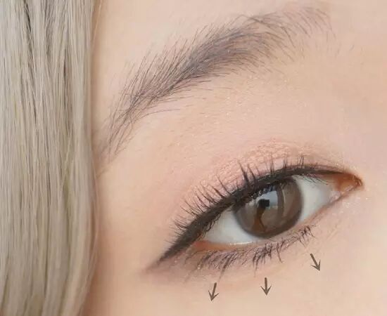 第六步:画好内外眼线,眼尾稍稍向下拉长,贴好自然型的上睫毛,想要泰妍一样的下睫毛,可以用眼线液笔画出自然的下睫毛。