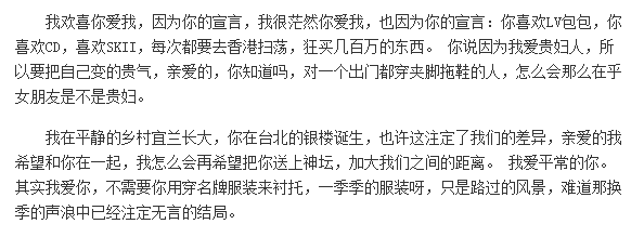 版本四:在大s和蓝正龙分手后的N年,从网上突然飘下一份疑似当初蓝正龙写给大s的分手信。大概意思是说大s拜金。