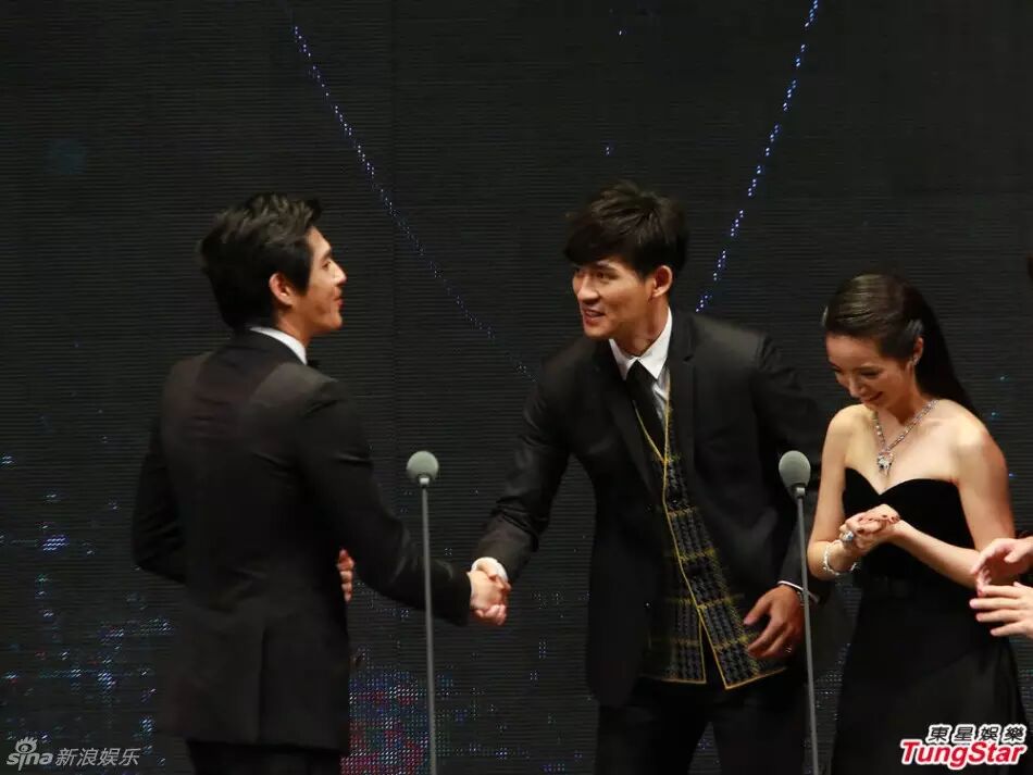 蓝正龙在今年金钟拿下最佳男主,仔仔作为13年的最佳男主给他颁奖。蓝正龙上台的时候,仔仔还冲他挑了一下眉,想必早没隔阂了吧?