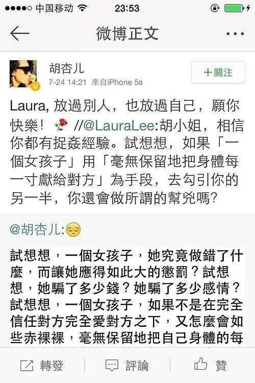 2014年马赛不雅视频遭曝光事件发生后,胡杏儿力挺马赛为其发声,马赛的情敌laura就曾直接揭露胡杏儿有捉奸经验。