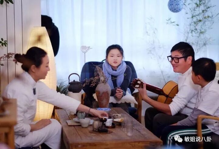 图片中,一家人围坐在茶桌边上,母亲潘蔚沏茶,孙楠弹琴,孙楠与前妻买红妹的一对儿女买宝瑶和孙苝则是默默坐在旁边,看起来十分温馨。