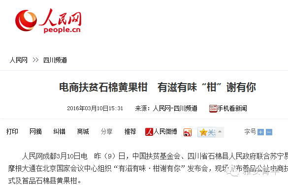 经雅安市群团组织社会服务中心牵线搭桥,3月9日,石棉县与中国扶贫基金会在北京成功召开“有滋有味·‘柑’谢有你”石棉黄果柑网络销售发布会,标志着政府和社会组织合作开展“互联网+扶贫”模式取得阶段性成果。