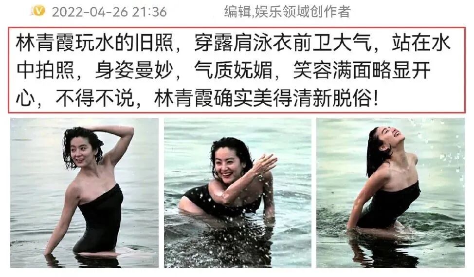 4月26日,有一位娱乐博主在网上晒出了一组林青霞玩水的旧照,并配文“林青霞玩水的旧照,穿露肩泳衣前卫大气,站在水中拍照,身姿曼妙,气质妩媚,笑容满面略显开心,不得不说,林青霞确实美得清新脱俗!”,这一组林青霞玩水的旧照火了,林青霞的气质引起了网友们的关注和热议。