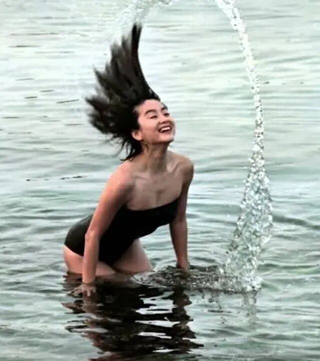 林青霞站在水中摆拍,她的拍照动作很豪放,就拿林青霞拍摄侧身照的拍照动作来说,林青霞蹲在水中,侧身对着镜头,做出了一个甩头发的动作,不仅显得她的侧身曲线很美,而且还显得她活力四射,令人有心动的感觉。