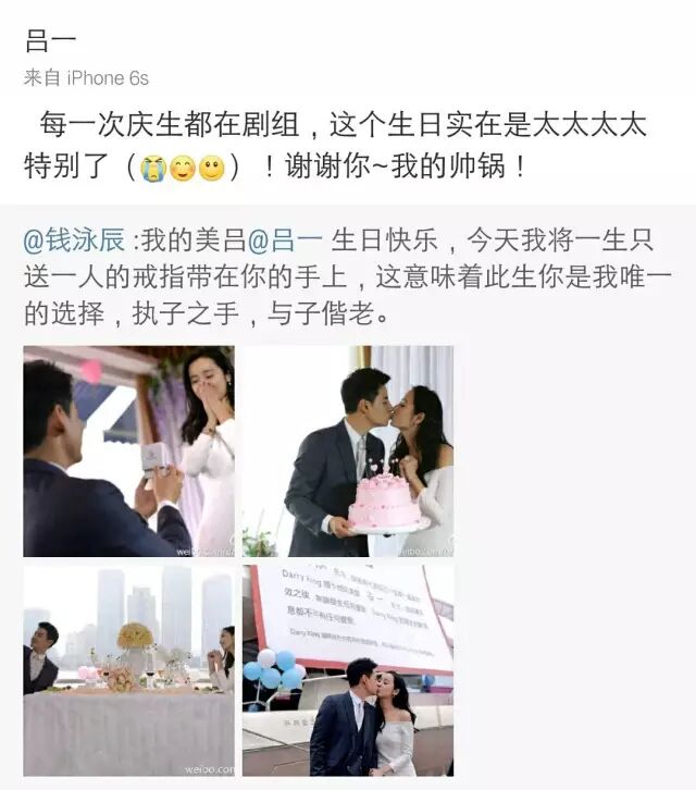 他表白说:“我的美吕,生日快乐,今天我将一生只送一人的戒指带在你的手上,这意味着此生你是我唯一的选择,执子之手,与子偕老。”