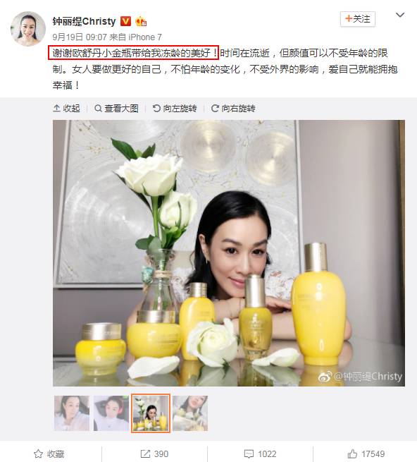 钟丽缇就在微博上发过,自己平日爱用的欧舒丹“小金瓶”,是她逆龄抗老的必备神器。