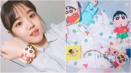 金香奇|睡衣,玩偶,手机壳,手表等都有蜡笔小新的踪影。金香奇的稚气美貌跟小巧可爱的蜡笔小新卡通形象充满了有趣的化学反应