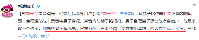 双方工作人员都否认了一轮,但两人微博已经不再互动都显出蛛丝马迹。12月20日,赫子铭被翻出电台节目里声声控诉无疑是实锤。港真,始终都没有想通,一个公众人物在怎么样的脑回路里会选择一个公开平台倾诉,悉数出:1、老婆出轨,在万圣节与他人开房、2、性生活不协调、3、收入不均衡,4、被要求净身出户、5,想争夺孩子抚养权等问题。