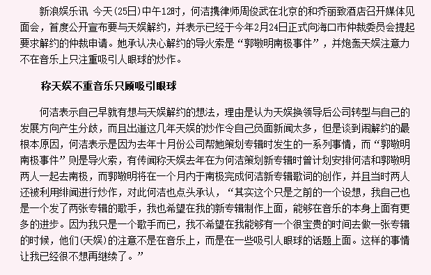 2009年,23岁的何洁在陈楚生之后向天娱提出解约。何洁首次开腔表示难忍老东家的太热爱炒作。