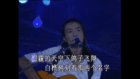 朴树,一头长发,在台上轻轻弹唱《白桦林》。