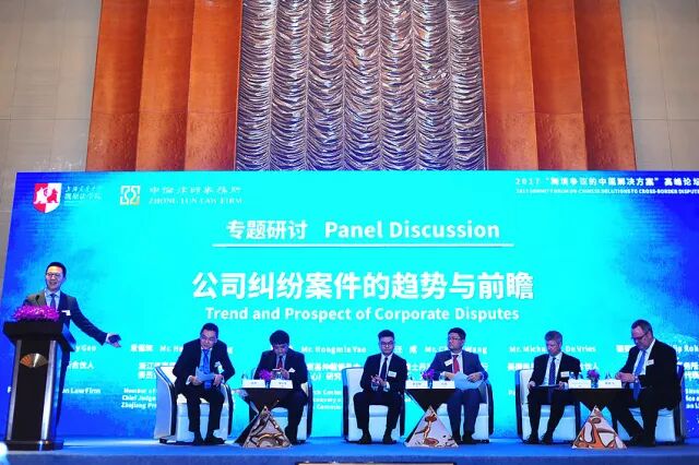 在中伦律师事务所争议解决部合伙人高俊律师的主持下,浙江省高级人民法院资深审判法官与上海国际经济贸易仲裁委员会(上海国际仲裁中心)研究中心主任姚宏敏、摩根士丹利亚洲法律合规部执行董事、大中华区法务负责人汪成、美国凯易律师事务所合伙人Michael W. De Vries共同探讨了跨境争议解决中公司纠纷案件的趋势和前瞻。