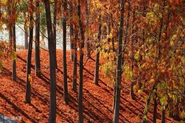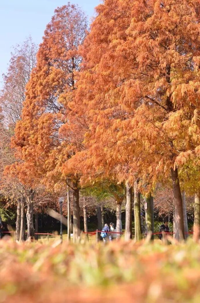 落羽杉一般从每年的11月开始逐渐进入休眠期,在此期间,枝叶逐渐从绿色转向黄色和古铜色;到了次年2月,落羽杉开始萌发出绿色。