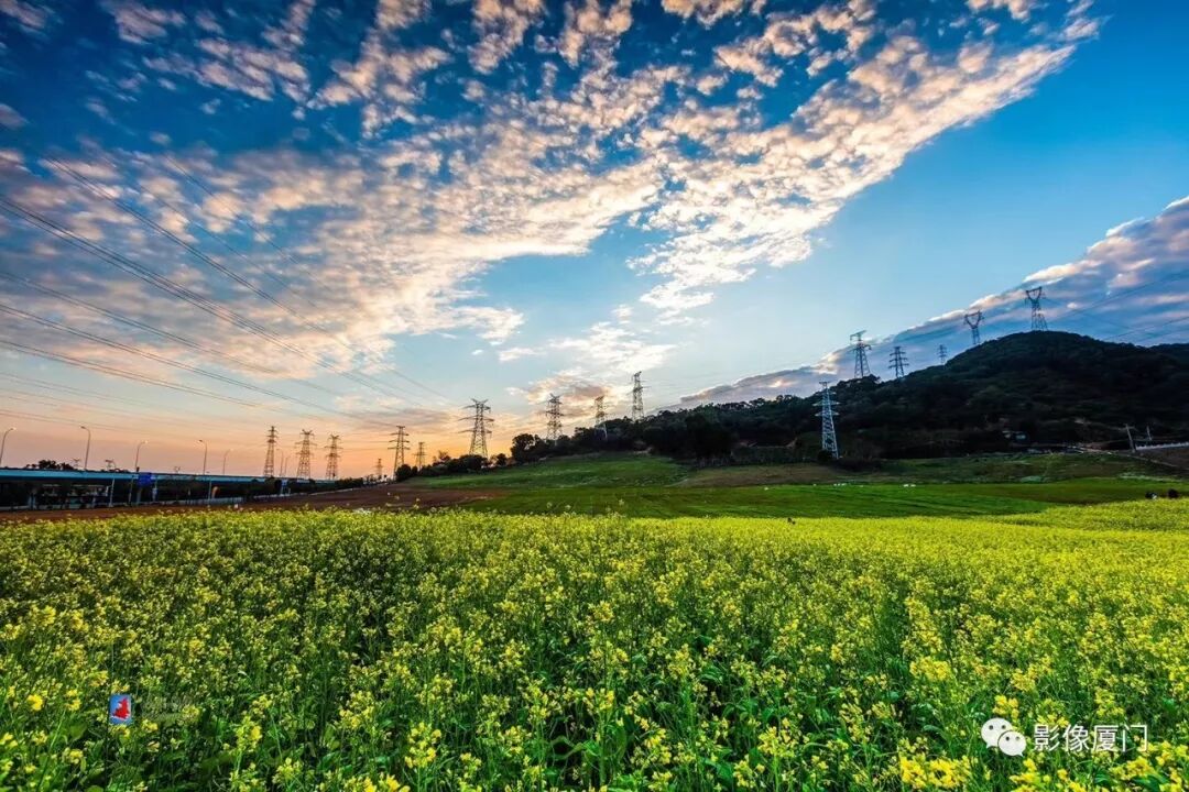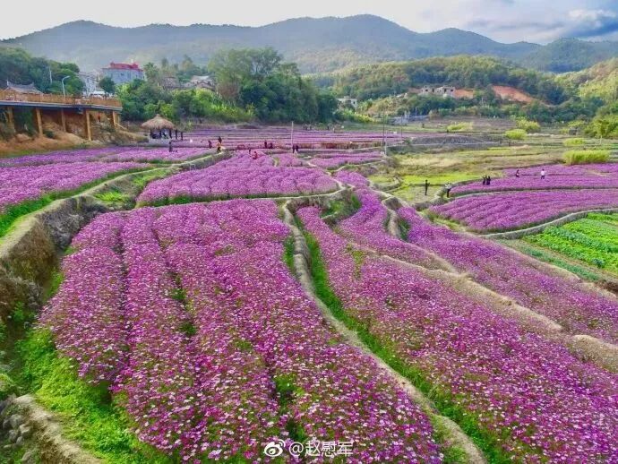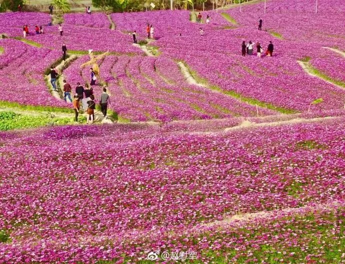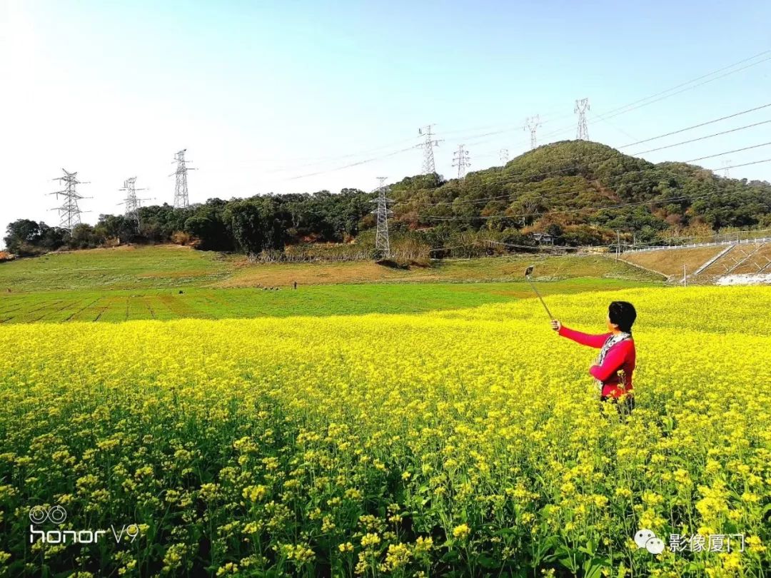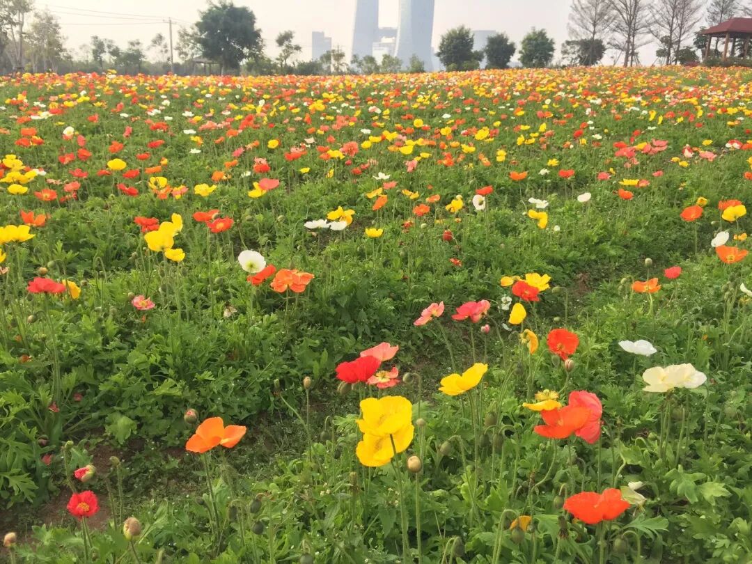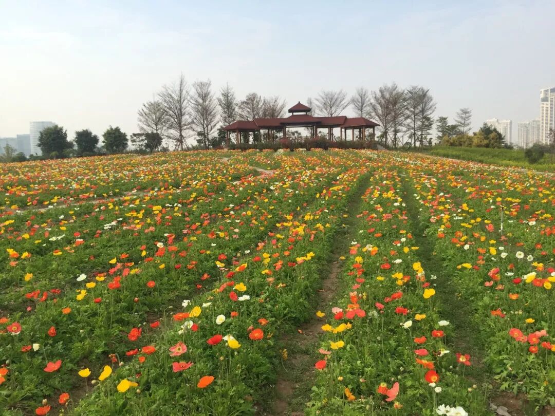 这片花海总面积为6万平方米,足足有8个足球场大,分两期种植不同的花种,有油菜花、万寿菊、红亚麻、蓝亚麻、虞美人、高雪轮、金盏菊、大波斯菊等。春节前后,更多花儿将陆续绽放。
