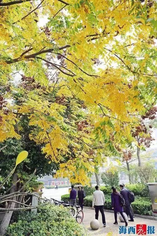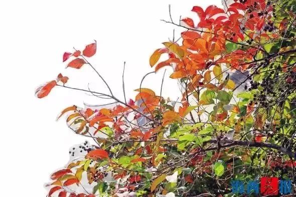 这个时节,大花紫薇的绿叶已不再,黄色由叶片边缘向中心渲染。有一些“着急”的叶片,则点上了红妆———靠近叶尖,红色晕染。而当这些叶片步入“老年期”,则会通体变得火红。