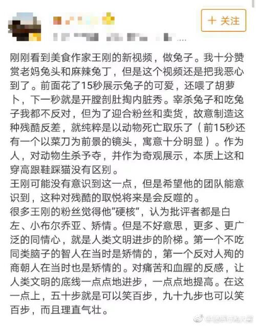 有网友认为,王刚此举是在“刻意迎合粉丝,纯粹以动物死亡取乐”。