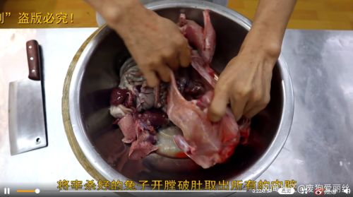 然而一转眼,这可爱的小灰兔就成了盆里的一团肉,王刚娴熟地掏出它的内脏。