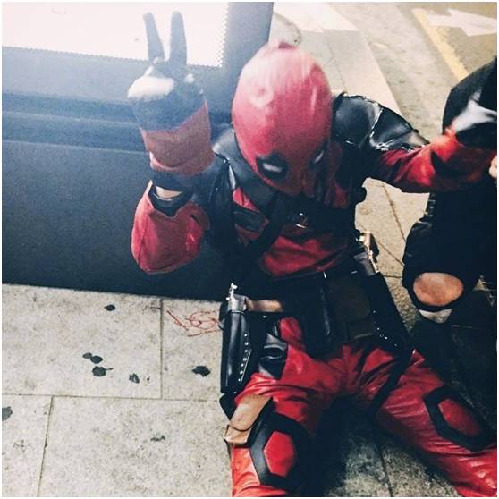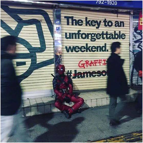 死侍也是近段时间很受宠的电影人物,而这个坐在路边看着往来行人的“小贱贱”真的是cos的极其像。