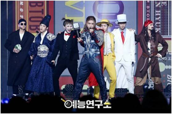 在某一场打歌中,七位成员更是直接以cos装扮登台。Peniel所cos的是《这个杀手不太冷》中的Leon,李旼赫cos的是王世子,队长徐恩光cos的是《电锯惊魂》里的面具男,任炫植cos的是雷神,李昌燮cos的是变相怪杰,陆星材cos的是怪盗基德,郑镒勋cos的是杰克船长。