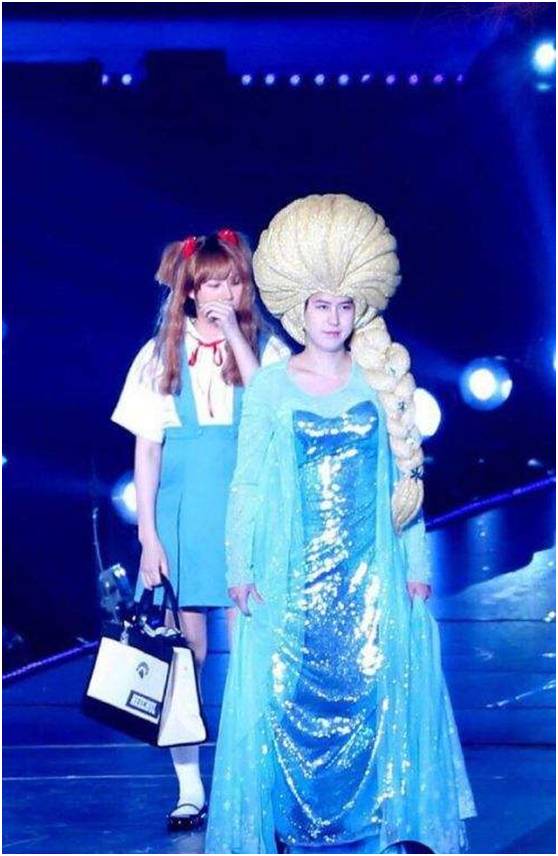 相信看过《冰雪奇缘》的宝宝一定能够认出圭贤的这一冰雪女王装扮,不过这厚重的假头套和傲人的事业线,让人分分钟出戏。