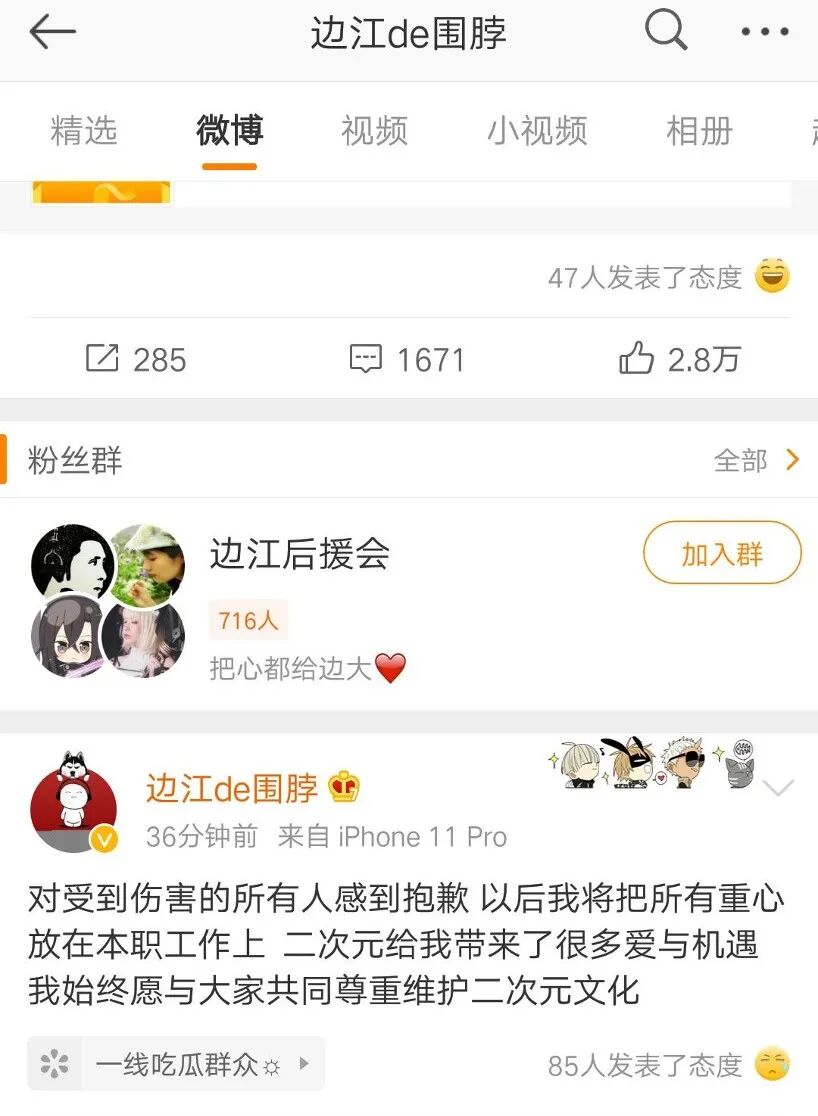 两个月前,配音演员边江公开给肖战送上生日祝福,遭到全网暴击。边江被逼无奈之下选择道歉:“对受到伤害的所有人感到抱歉,以后我将把所有重心放在本职工作上,二次元给我带来了很多爱与机遇,我始终愿与大家共同尊重维护二次元文化。”