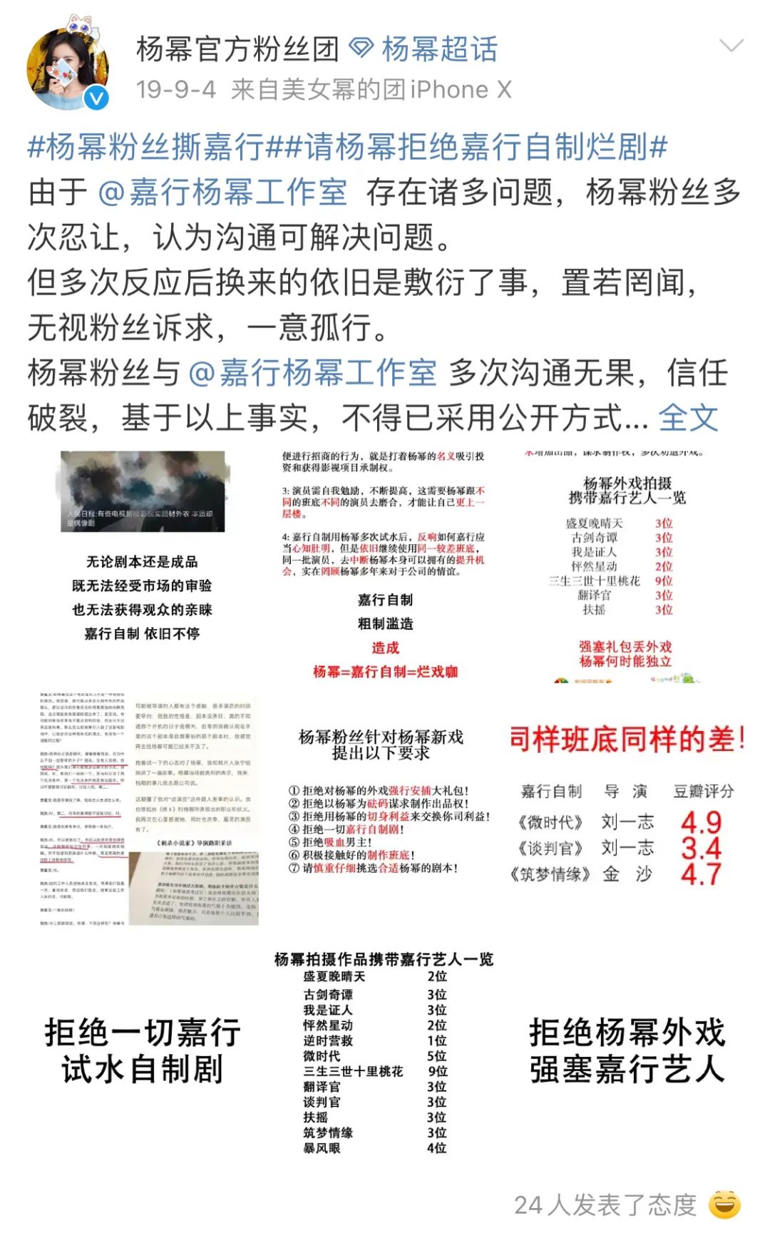 2019年,杨幂和迪丽热巴所在的嘉行传媒受到这两位偶像的粉丝集体抵制,直接原因是工作室文案有瑕疵、照片不够让粉丝满意等,“积怨”则是粉丝认为,经纪公司没有给他们的偶像提供最佳的资源、规划等。