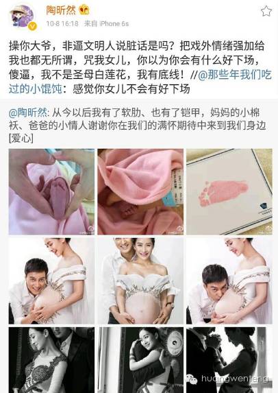 今天下午,在最近热播的《胭脂》中饰演冯曼娜的陶昕然在微博上爆粗口,因有网友诅咒其刚出生的女儿“不会有好下场”↓↓