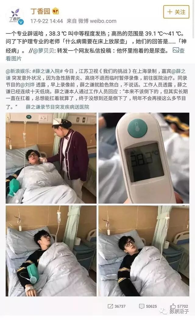 然而这组照片瞬间就被丁香园啪啪啪打脸了。丁香园转发微博说:一个专业辟谣哈,38.3 ℃ 叫中等程度发热;高热的范围是 39.1 ℃~41 ℃。问了下护理专业的老师「什么病需要在床上放尿壶」,她们的回答是……「神经病」。哈哈哈哈,丁香园医生是和薛之谦有仇吗?
