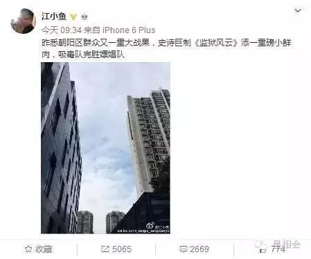 近日,朝阳群众再次发威了。微博爆料娱乐圈某L姓艺人吸毒被抓,目前真假未知,监狱风云吸毒队添一重磅小鲜肉!这位叫江小鱼的博主微博认证是电影导演、影评人,也是娱乐圈人士,这样的消息应该不会差吧!电影导演江小鱼的微博称:“昨悉朝阳区群众又一重大战果,史诗巨制《监狱风云》添一重磅小鲜肉,吸毒队完胜嫖娼队。”