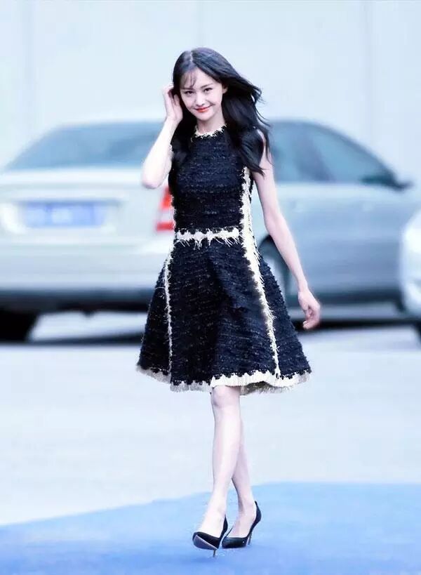 穿上黑色细高跟鞋的郑爽,透出一股优雅的女人味,黑白的连衣裙经典而又时尚。