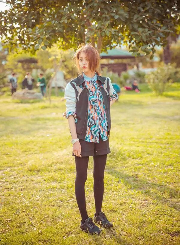 带点抽象图案的背心上衣,清新舒适的绿色让人觉得心旷神怡,杂乱不堪的发型透出了少女的率性与随意感。