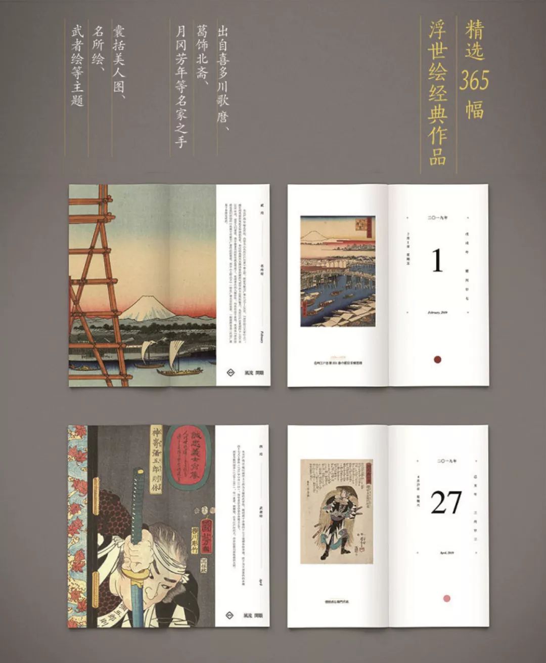 以日本浮世绘为题材,精选365幅喜多川歌麿、葛饰北斋等名家的经典作品,分为美人图、名所绘、武者绘等主题。