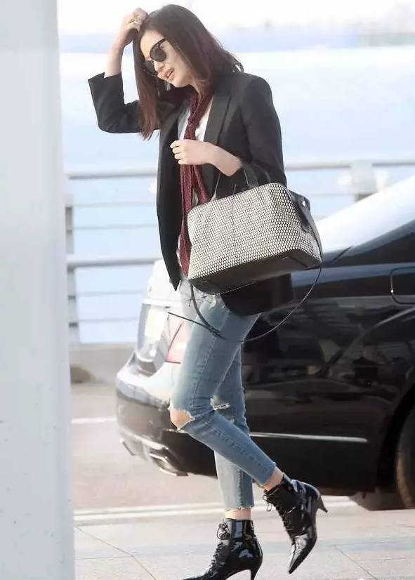 基本款的西装外套、修身牛仔裤、尖头鞋,配上她那无处安放的大长腿,随便一站都是一张简约大气的街拍。