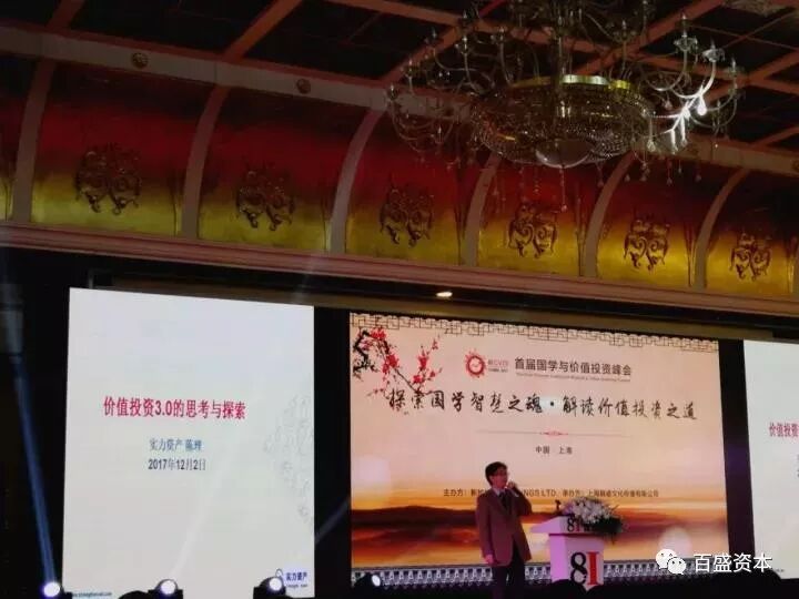 那么回到今天的主题:国学与价值投资,正好给大家汇报一下最近参加了由巴菲特授权的机构奥马哈价值投资教育与研究中心在北京主办的2017第二届全球投资大会,他们把价值投资分为以下三个阶段:第一个阶段是格雷厄姆的财务投资法,通过财务报表分析;第二个阶段是巴菲特的长期投资;第三个阶段他们认为是创业投资阶段,在前两个阶段基础上加了两个因素,创新和国际化,这是他们的观点。碰巧我也一直在探索这个事情,第一个阶段是不折不扣、原汁原味地学巴菲特,在这个过程中呢,因为中国的国情不同、时代也变了,个性不一样,所以我们有自己的思考,但是巴菲特、格雷厄姆基本的东西都是不变的、都是放之四海而皆准的。