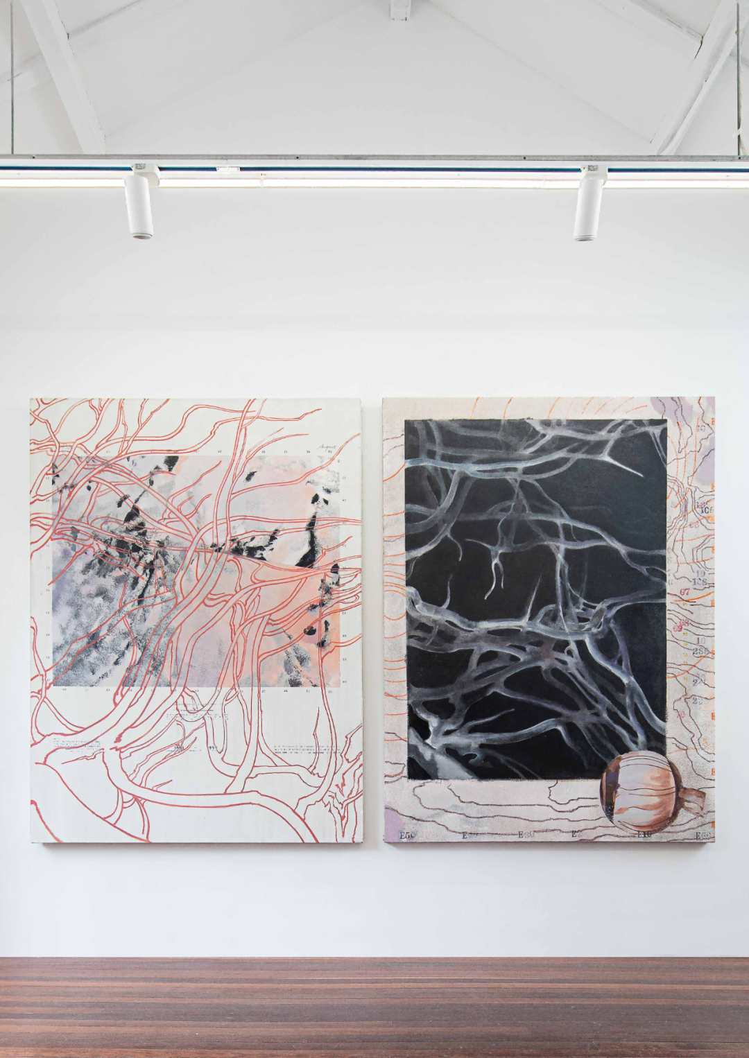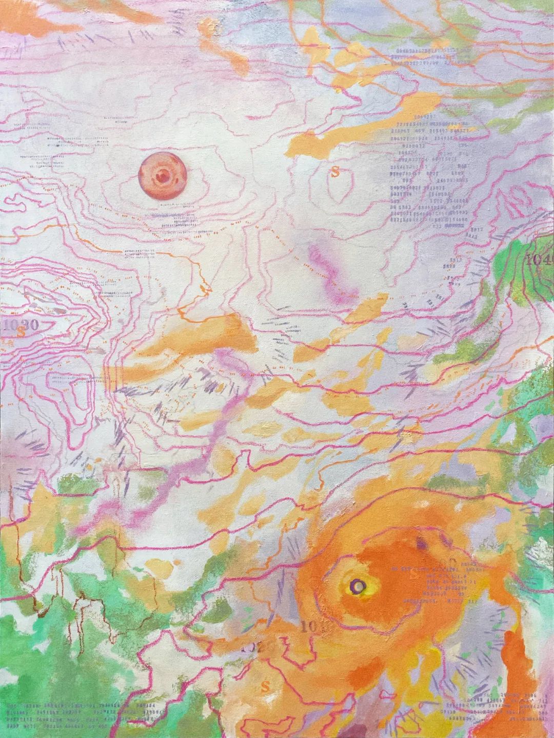 而在《网络》和《共显》这组作品中,金瀚进行了大胆尝试,将等高线,眼部神经,抽象地图和树枝状蔓延的血管用神秘的“暗号”(经纬度标注等)相连。