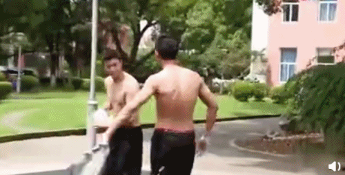 两个大帅哥越来越上头,干脆甩了上衣,一起痛快流汗。