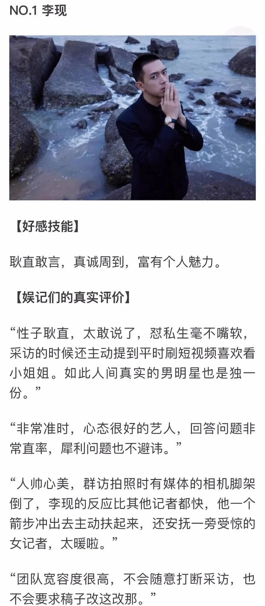 因为耿直敢言、真诚周到、时间观念强,李现还登上了各位娱记评选出的2020年度明星红榜top1。