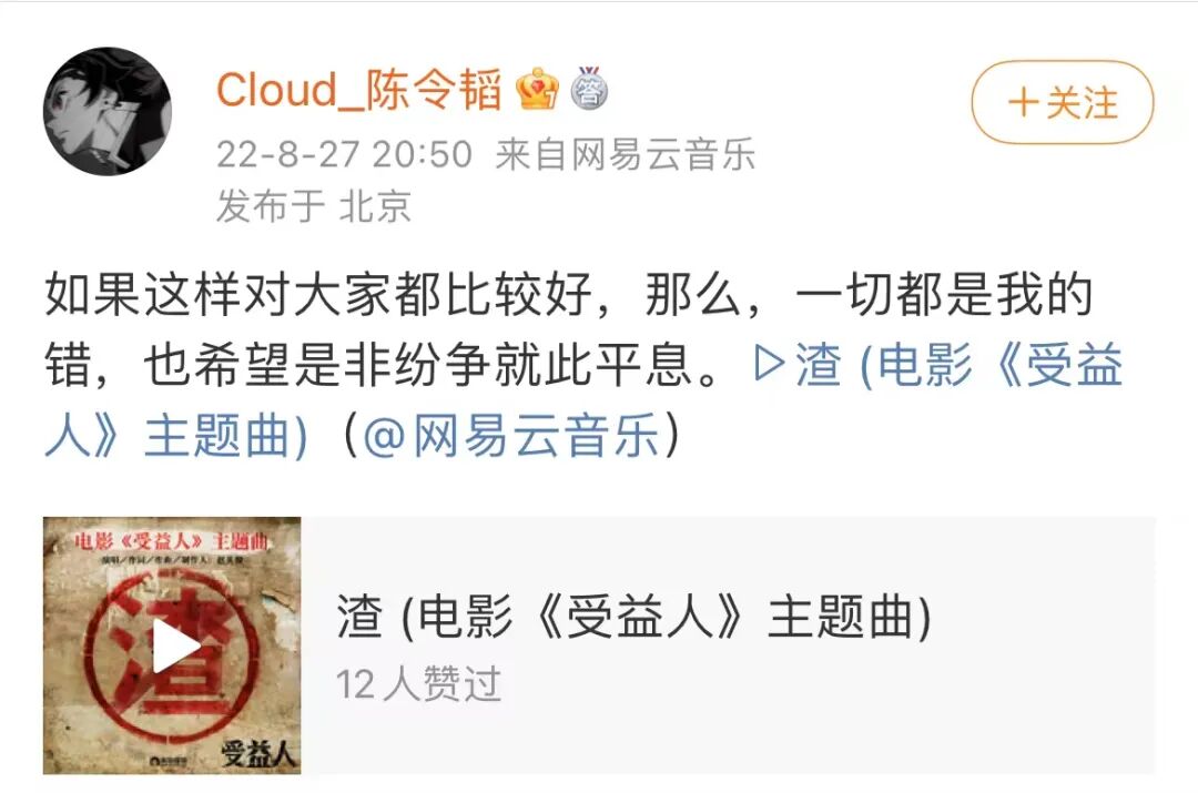 还分享了一首电影 OST 歌曲——《渣》,似乎是想通过这种方式表示,自己愿意承担这件事的后果。