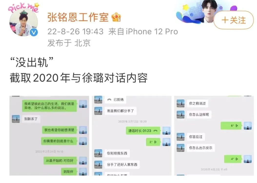 张铭恩方梳理时间线,否认和徐璐恋爱期间出轨胡冰卿