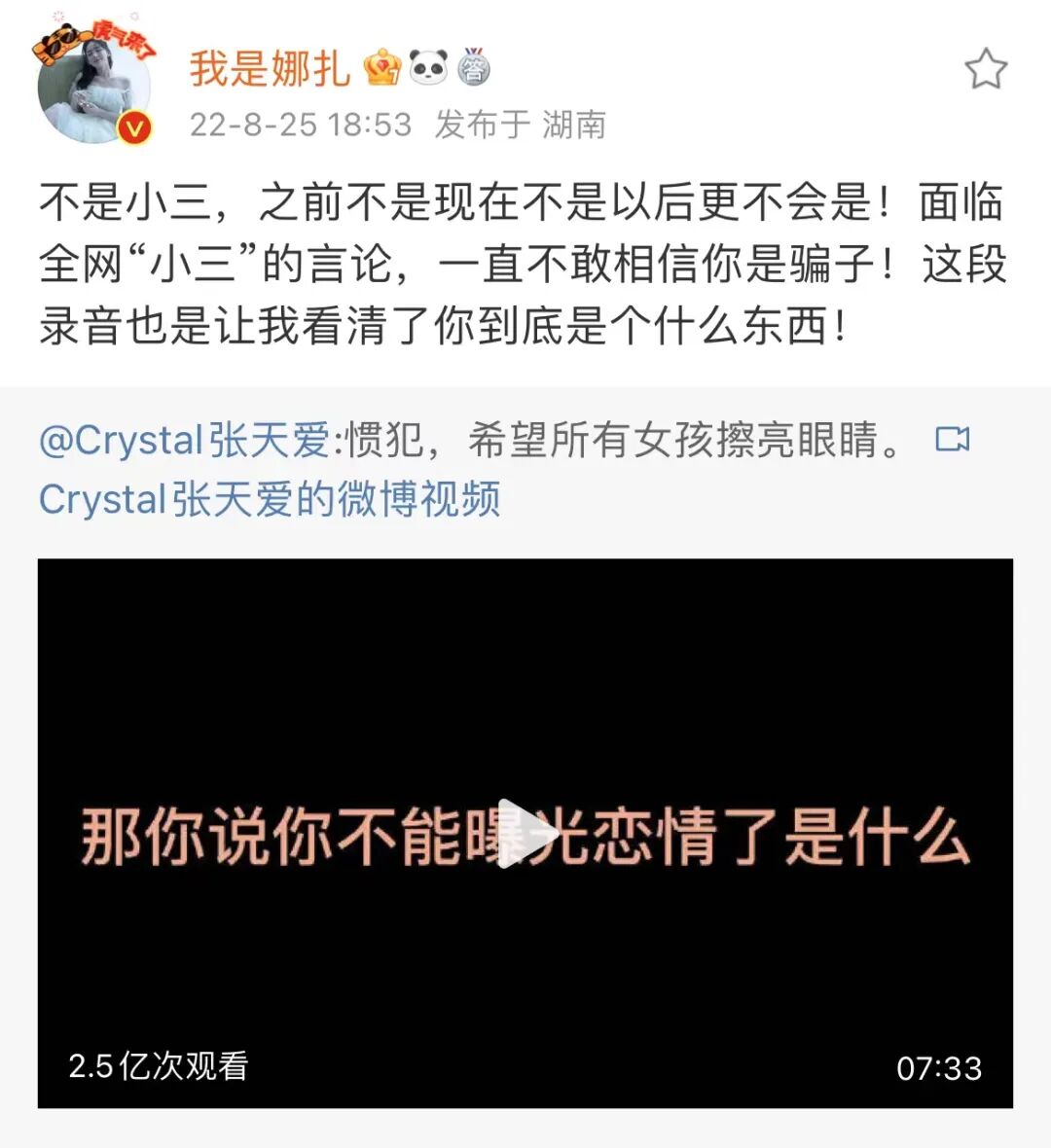 娜扎开头的“不是小三,之前不是现在不是以后更不会是!”这句话,也顺带否认了自己是前男友张翰和某爽感情中小三的说法。