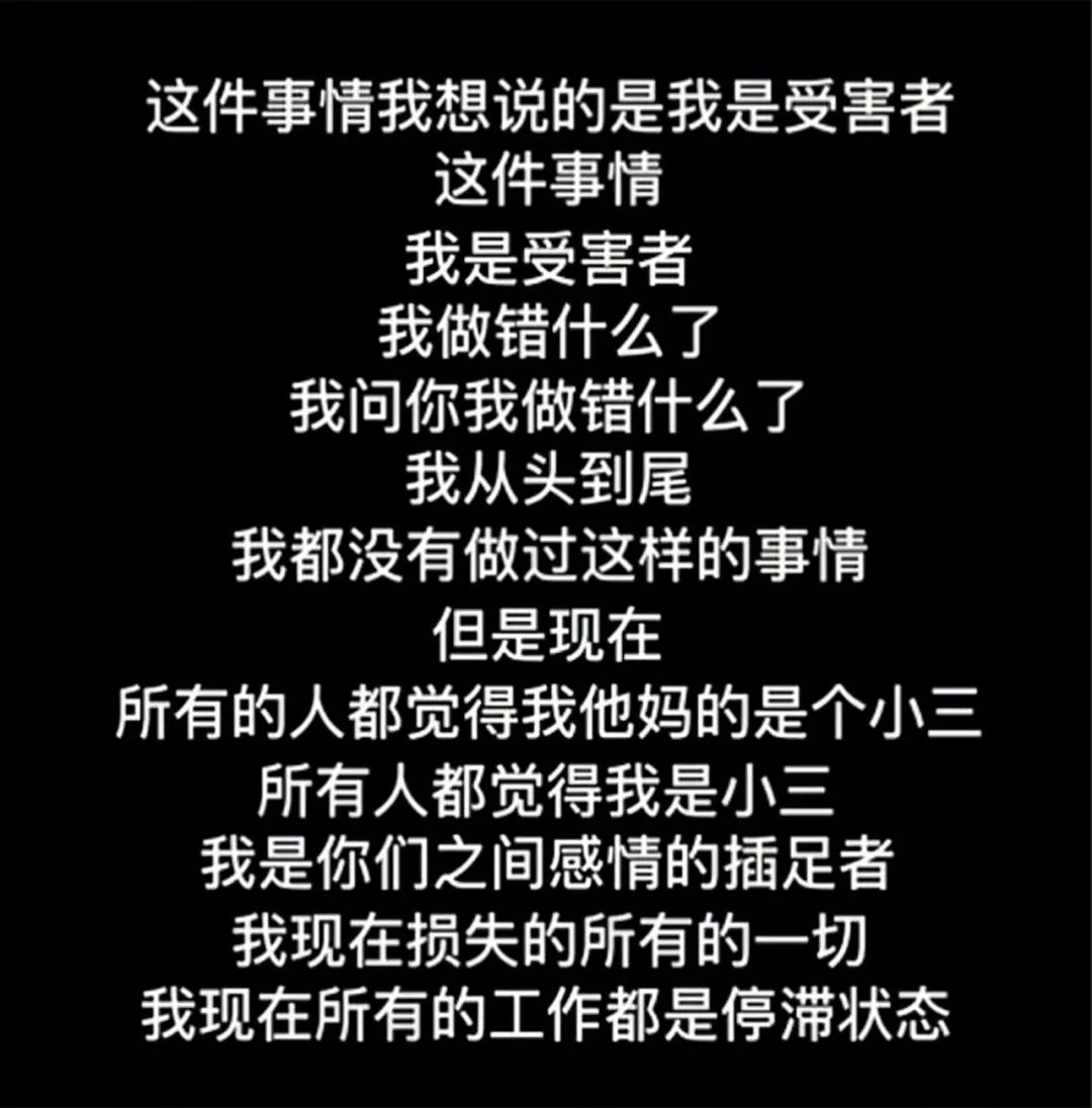 2.声明自己是受害人,从来没有想过要当小三,但现在因为这件事情大家都误会她是第三者。无辜被卷进风波,导致工作被停滞,她非常痛苦。